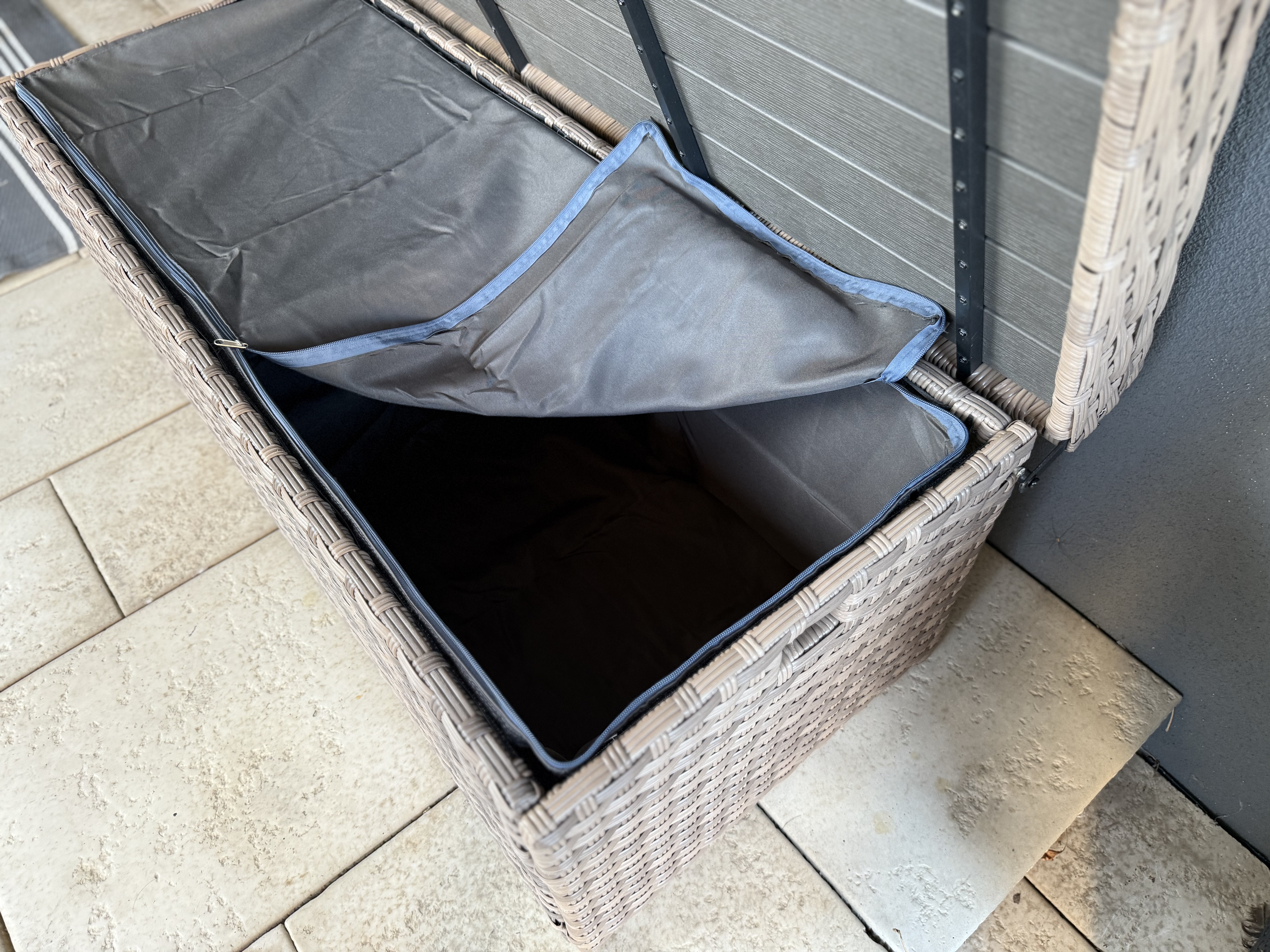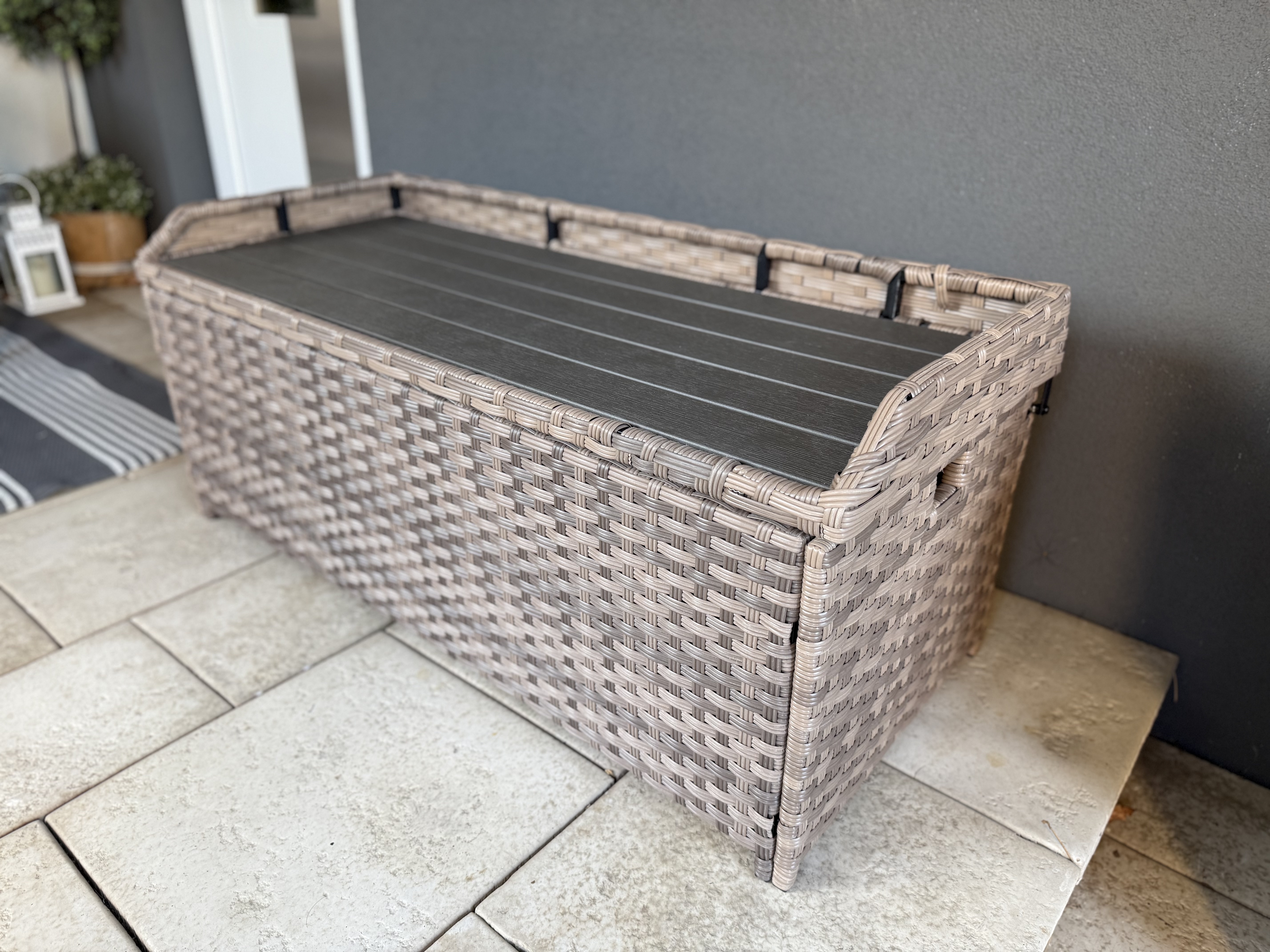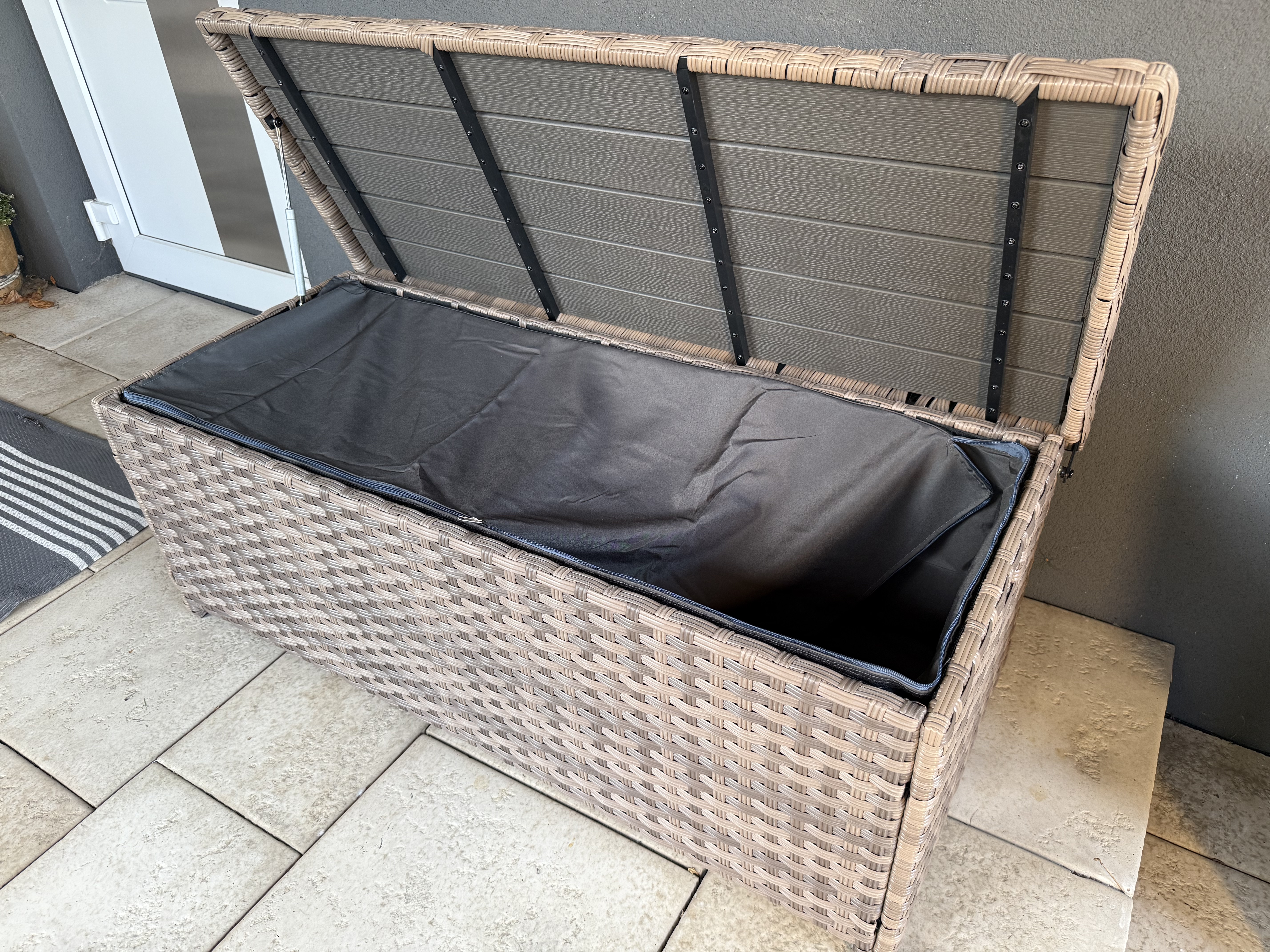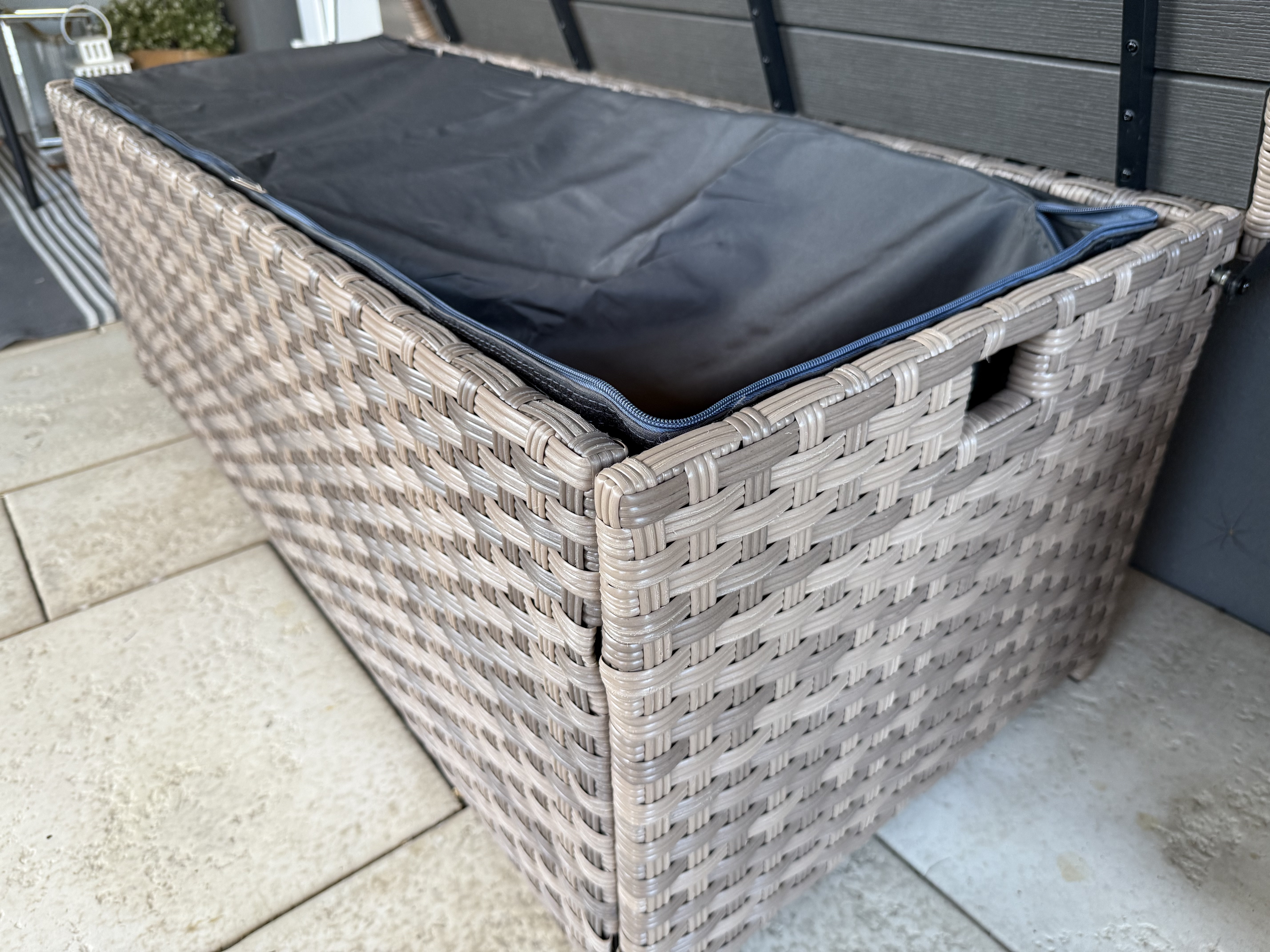 Praktyczna konstrukcja pozwala przechowywać poduszki, koce lub akcesoria ogrodowe - ✅ Wytrzymały technorattan